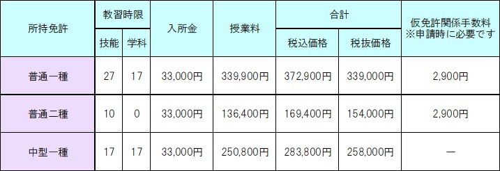○仮免許関係手数料2,900円(非課税)は修了検定合格時にお支払い下さい。